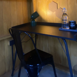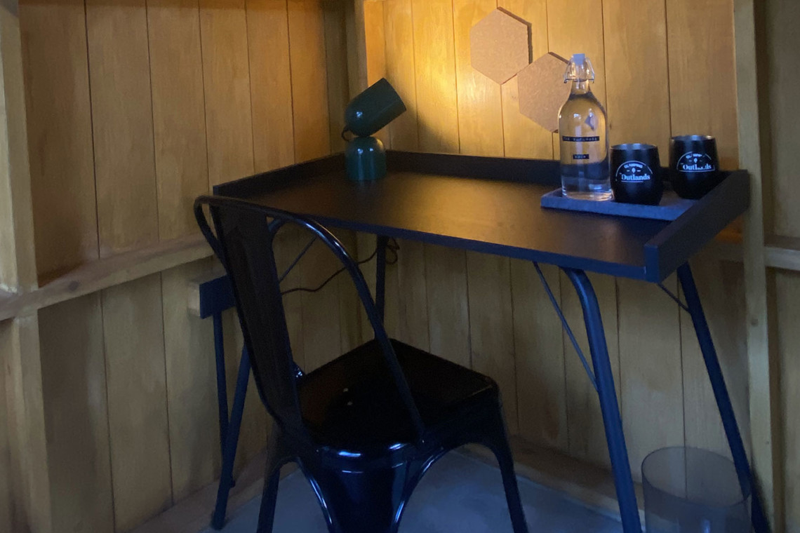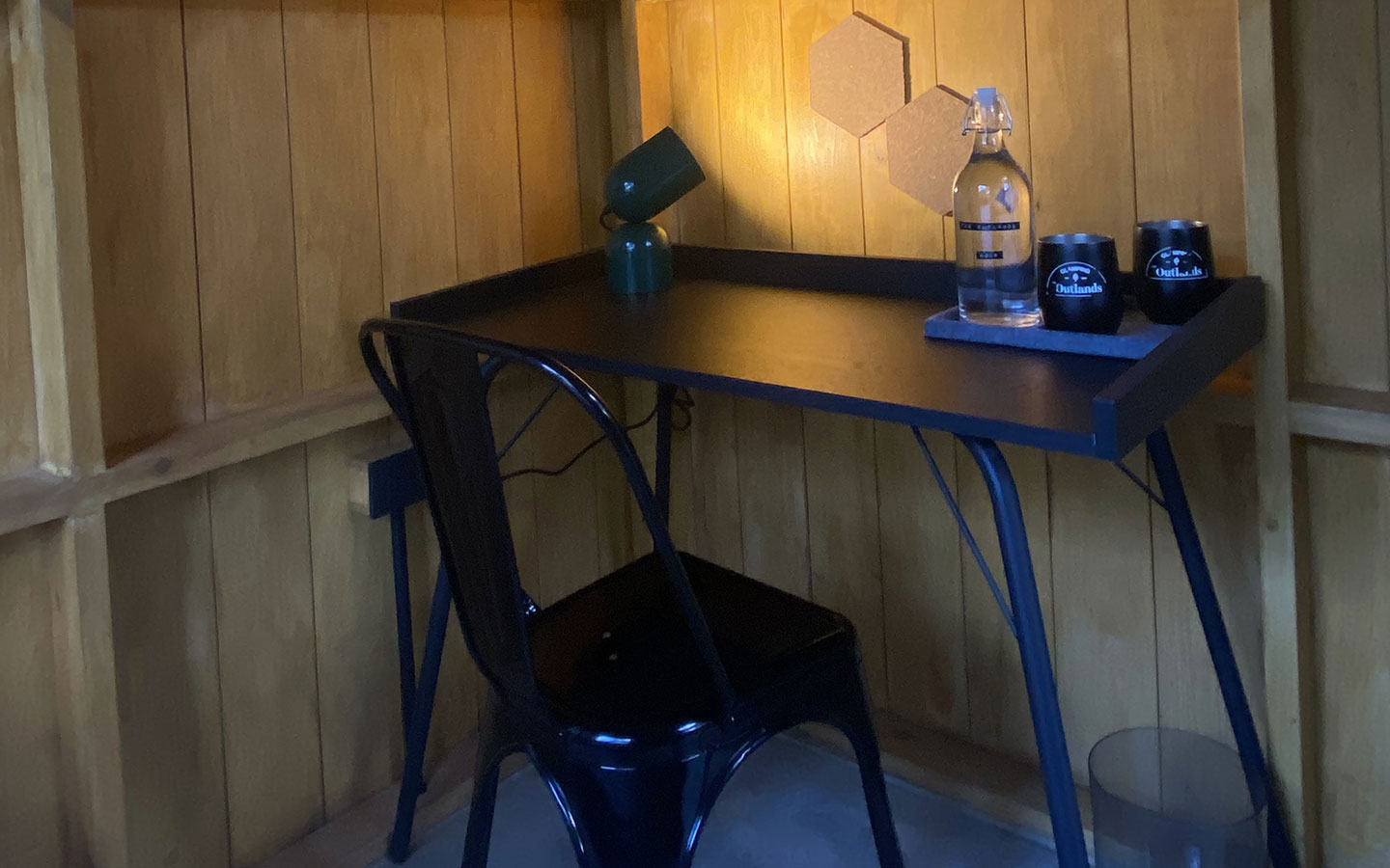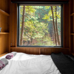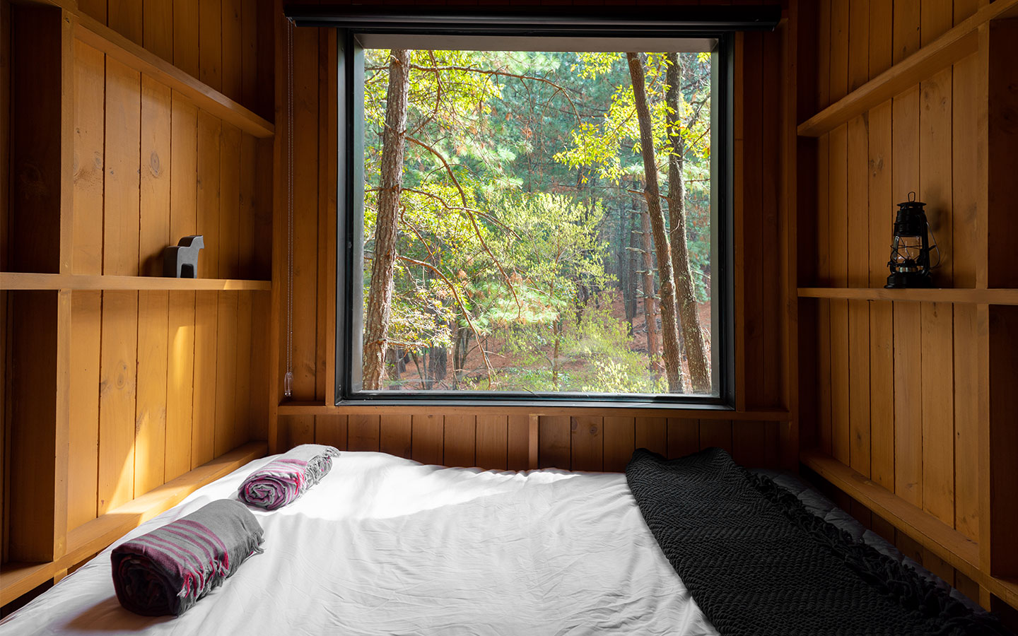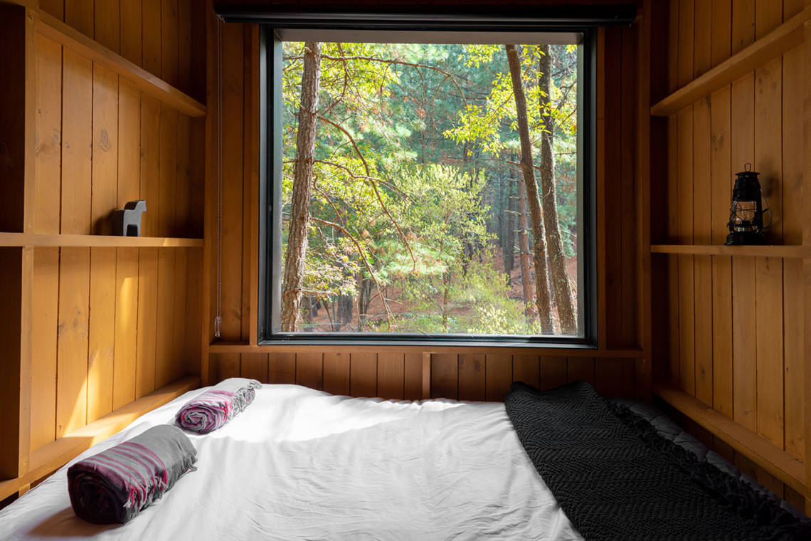 Nuestro refugio ofrece una vista hermosa del bosque desde la gran ventana a un lado de la cama. Tiene justo lo que necesitas para tener una noche rodeado de naturaleza en una muy cómoda y calientita cama dentro de esta cabaña minimalista de madera.
